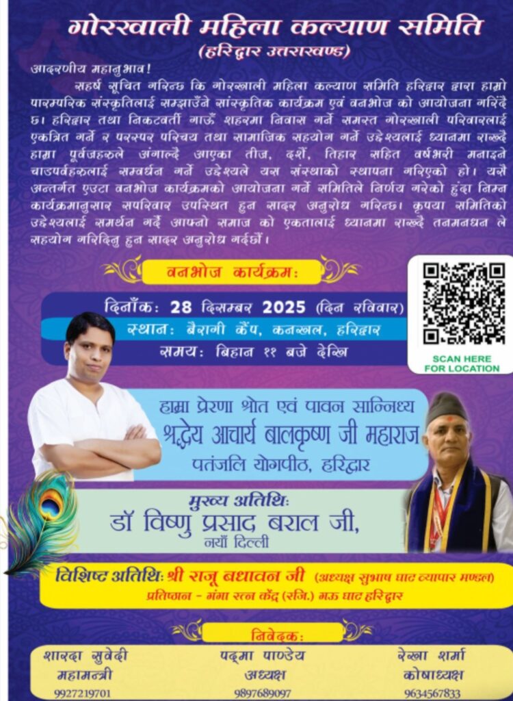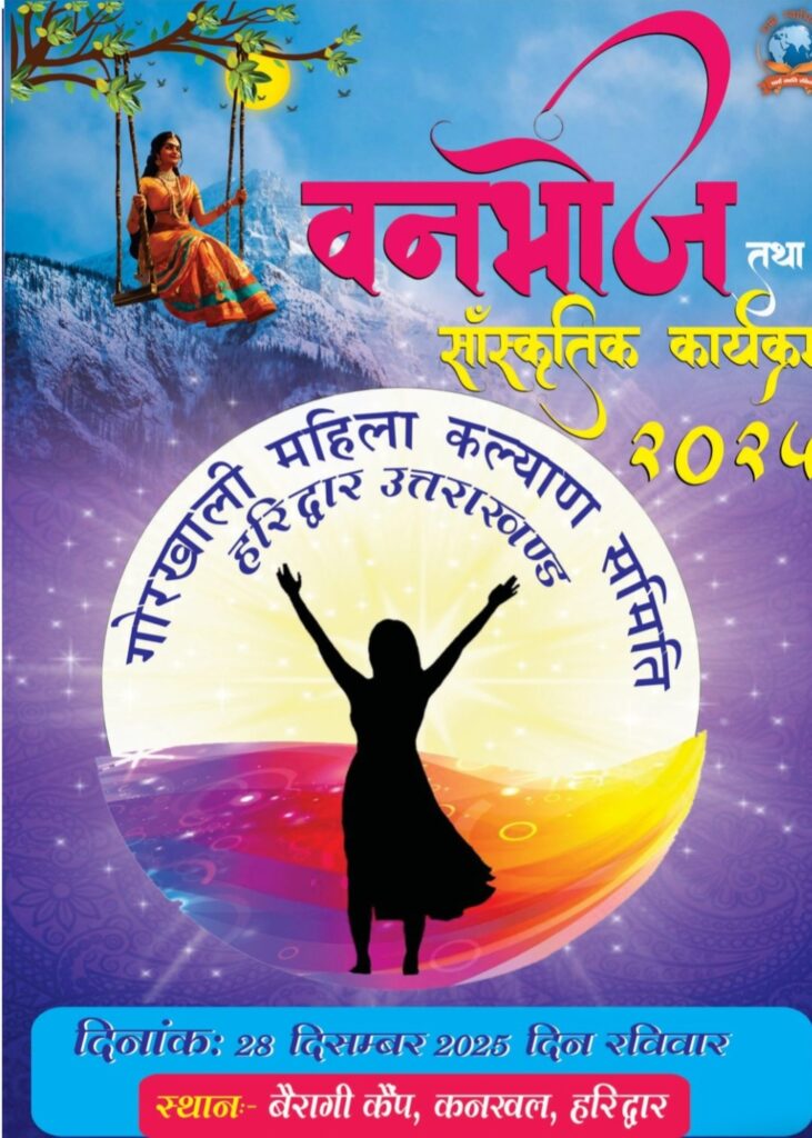 हरिद्वार। आगामी 28 दिसंबर को हरिद्वार में गोर्खाली महिला कल्याण समिति की ओर से वनभोज एवं सांस्कृतिक महोत्सव का भव्य आयोजन किया जाएगा। कार्यक्रम का आयोजन हरिद्वार के बैरागी कैंप क्षेत्र में किया जाएगा, जिसमें बड़ी संख्या में गोरखाली समुदाय के लोग शामिल होंगे।