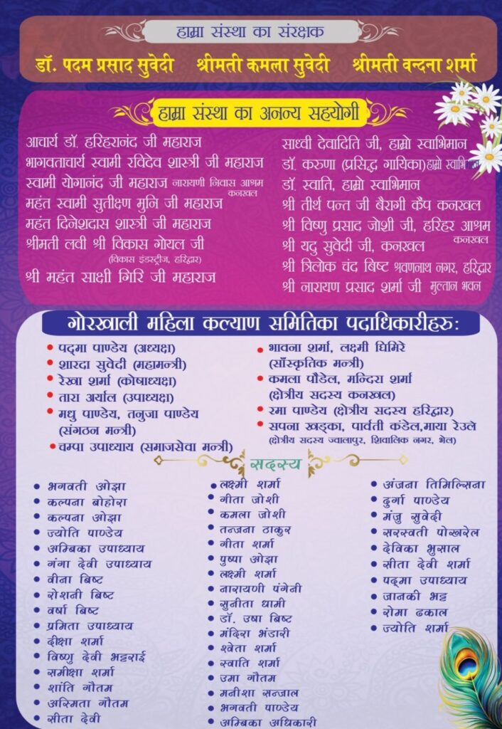इस अवसर पर डॉ. पदम प्रसाद सुवेदी श्रीमती कमला सुवेदी श्रीमती वन्दना शर्मा आचार्य डॉ. हरिहरानंद जी महाराज भागवताचार्य स्वामी रविदेव शास्त्री जी महाराज स्वामी योगानंद जी महाराज नारायणी निवास आश्रम कनखल महंत स्वामी सुतीक्ष्ण मुनि जी महाराज महंत दिनेशदास शास्त्री जी महाराज डॉ. विष्णु प्रसाद बराल जी दिल्ली श्रीमती लवी श्री विकास गोयल जी विकास इंडस्टीज, रिलाय श्री महंत साक्षी गिरि जी महाराज साध्वी देवादिति जी, हाम्रो स्वाभिमान डॉ. करुणा (प्रसिद्ध गायिका) डॉ. स्वाति, श्री तीर्थ पन्त जी बैरागी कैप कनखल श्री विष्णु प्रसाद जोशी जी, हरिहर आश्रम श्री यटु सुवेदी जी कनखल श्री त्रिलोक चंद बिष्ट श्रवणनाथ नगर, हरिद्वार श्री नारायण प्रसाद शर्मा जी मुल्तान भवन आदि उपस्थित रहे l