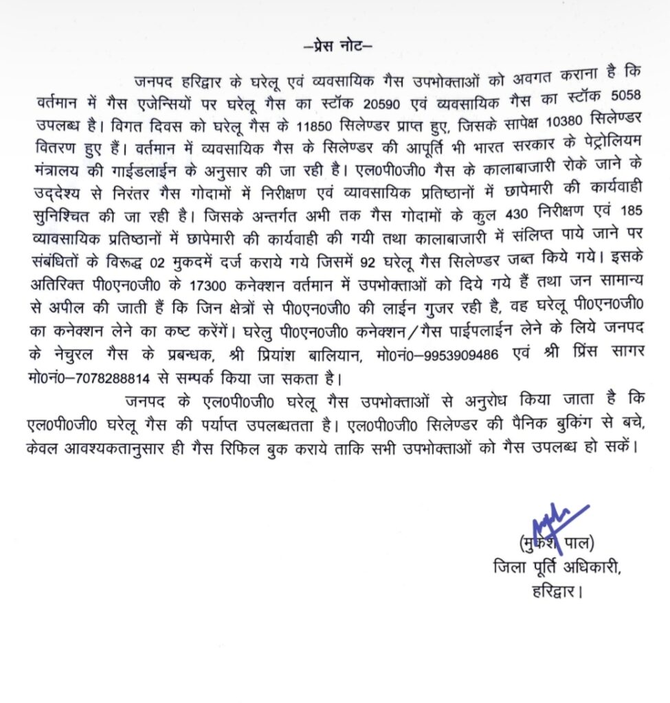 👉 साफ है—हरिद्वार में गैस की कोई कमी नहीं, लेकिन कालाबाजारी करने वालों पर प्रशासन की नजर बेहद सख्त है।