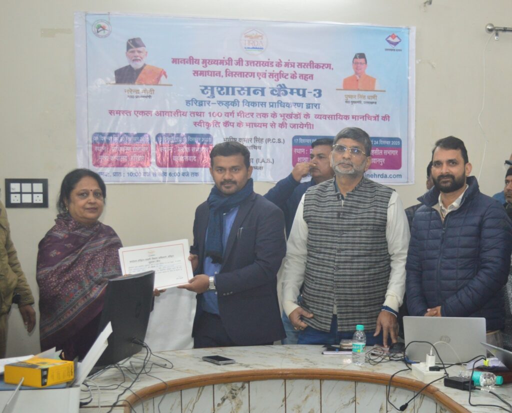 माननीय मुख्यमंत्री श्री पुष्कर सिंह धामी के सरलीकरण, समाधान, निस्तारण एवं संतुष्टि के मंत्र को आगे बढ़ाते हुए हरिद्वार–रुड़की विकास प्राधिकरण (HRDA) द्वारा आज सुशासन कैंप का सफल आयोजन हरिद्वार रुड़की विकास प्राधिकरण, शाखा कार्यालय रुड़की के सभागार में किया गया। इससे पूर्व भी दो सुशासन कैंप आयोजित किए जा चुके हैं।