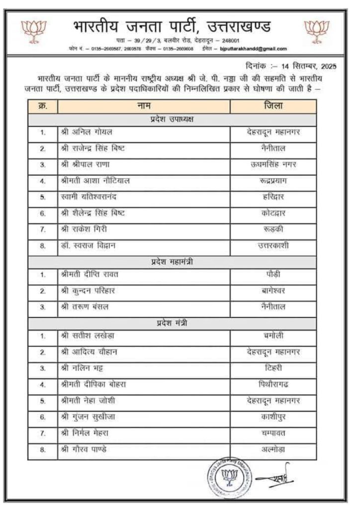 प्रदेश उपाध्यक्ष : अनिल गोयल, राजेंद्र बिष्ट, श्रीपाल राणा, आशा नौटियाल, स्वामी यतीश्वरानंद, शैलेंद्र सिंह बिष्ट, राकेश गिरी, डॉ. स्वराज विद्वान।