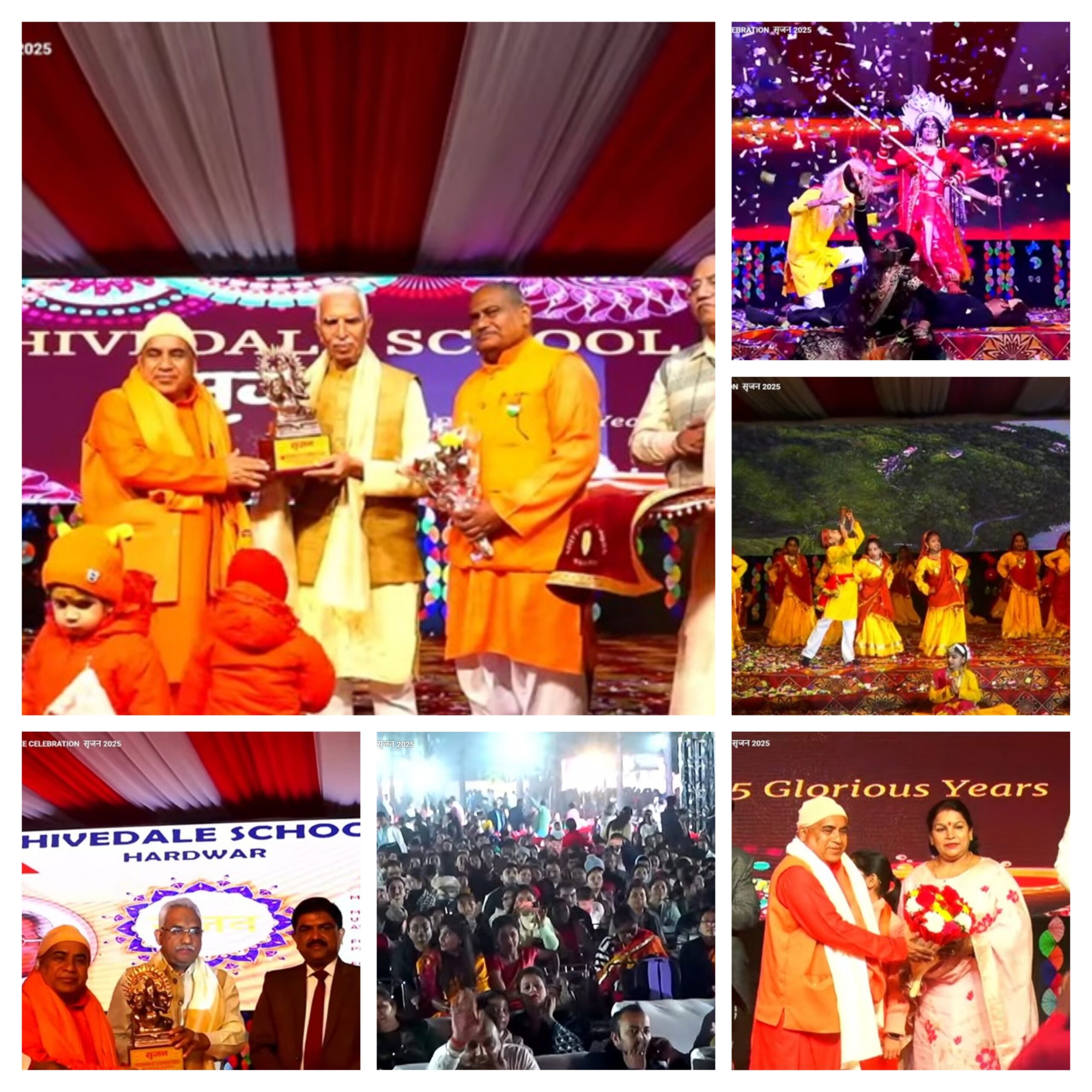 इसके पूर्व रजत जयंती समारोह सृजन का उदघाटन स्वामी शरदपुरी जी ने स्वतंत्रता संग्राम सेनानी भारत भूषण विद्यालंकार, स्वामी चेतनानंद, स्वामी रामानंद गिरि, स्वामी केशवानंद तथा जितेन्द्र रघुवंशी के द्वारा दीप प्रज्ज्वलित कराकर किया। गणेश वंदना तथा स्वागत गीत के साथ ही बच्चों ने मनमोहक सांस्कृतिक कार्यक्रम प्रस्तुत किए। नर्सरी से पांचवी तक के बच्चों की प्रस्तुतियों की उपस्थिति अपार जन समूह ने दिल खोलकर प्रशंसा की।