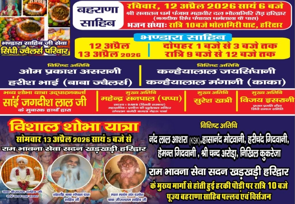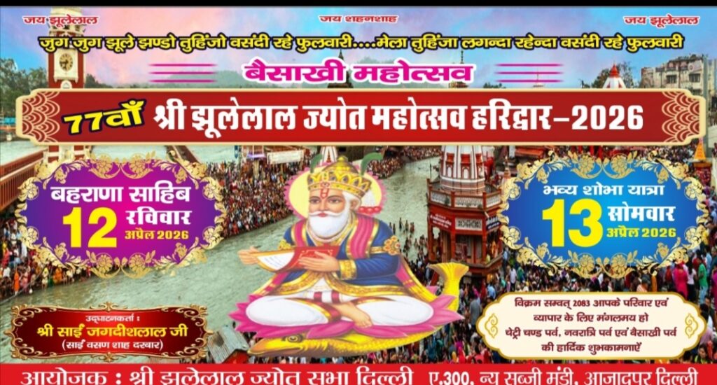 हरिद्वार में सिंधी समाज द्वारा आयोजित 77वां श्री झूलेलाल ज्योत महोत्सव 2026, बहराणा साहिब और बैसाखी महोत्सव के पावन अवसर पर श्रद्धा, भक्ति और उल्लास का अद्भुत संगम देखने को मिला। “रहे फुलवारी… मेला तुहिंजा लगन्दा रहेन्दा, वसंदी रहे फुलवारी” की मंगलकामनाओं के साथ पूरा वातावरण भक्तिमय हो उठा।