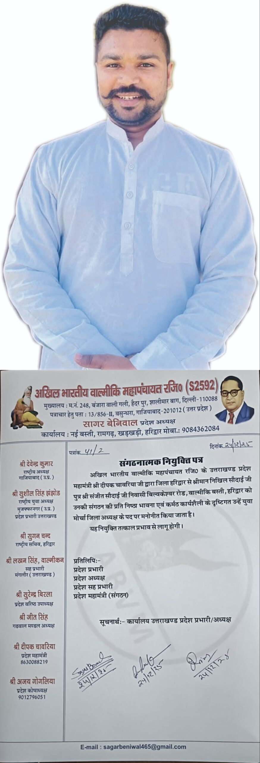 हरिद्वार युवा मोर्चा के जिला अध्यक्ष बन गए निखिल सोदाई जी अखिल भारतीय वाल्मीकि महापंचायत मैं हुआ युवा कार्यकारिणी का गठन प्रदेश महामंत्री दीपक चावरिया जी सहित संगठन के पदाधिकारी ने दी बधाई।