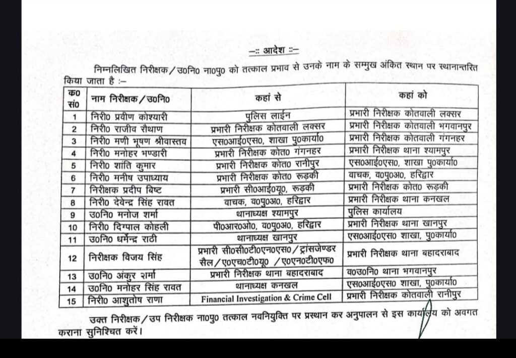 हरिद्वार। एसएसपी हरिद्वार प्रमेन्द्र डोभाल ने देर रात 11 इंस्पेक्टरों सहित चार दरोगाओं के कार्यक्षेत्र में परिवर्तन किया है। निरीक्षक देवेंद्र सिंह रावत को कनखल की , निरीक्षक विजय सिंह को बहादराबाद की एवं निरीक्षक आशुतोष राणा को रानीपुर हरिद्वार की मिली जिम्मेदारी बाकी देख ले लिस्ट-,